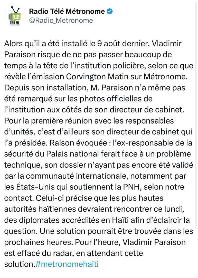 Selon métronome, un media de la place, qui explique à travers un tweet que cela est du à cause du blanc, il est à l’heure actuelle effacé du radar. Et oui toujours le blanc qui n’accepte pas encore cette nomination. Pour être un DG de la PNH, il faut être un joueur du blanc pour faire le travail du blanc (DG esclave que le blanc colon passe des ordres) sinon cette nomination pourrait ne pas être valide.