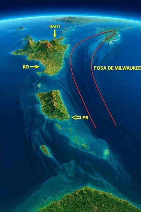 A509 | (Science) Il s'agit d'une vue topographique et sous-marine des Caraïbes, se concentrant sur l'île d'Hispaniola (où se trouvent Haïti et la République dominicaine), Porto Rico et la dangereuse