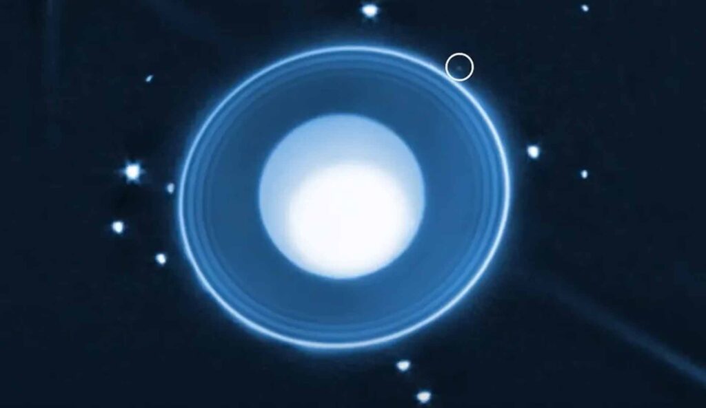Uranus compte désormais officiellement 29 satellites. Le 19 août 2025 a été annoncée la découverte d’un corps d’environ 10 m de diamètre gravitant en bordure des fins anneaux qui entourent la lointaine planète bleue, à environ 2,8 milliards de kilomètres du Soleil. L’équipe américaine menée par Maryame El Moutamid, du SwRI’s Solar System Science and Exploration Division, à Boulder (Colorado), a eu recours au puissant télescope spatial James Webb pour dénicher cet astre minuscule le 2 février 2025. Dix images prises en infrarouge sur un laps de temps de six heures ont permis de repérer le satellite qui se déplaçait sur son orbite.